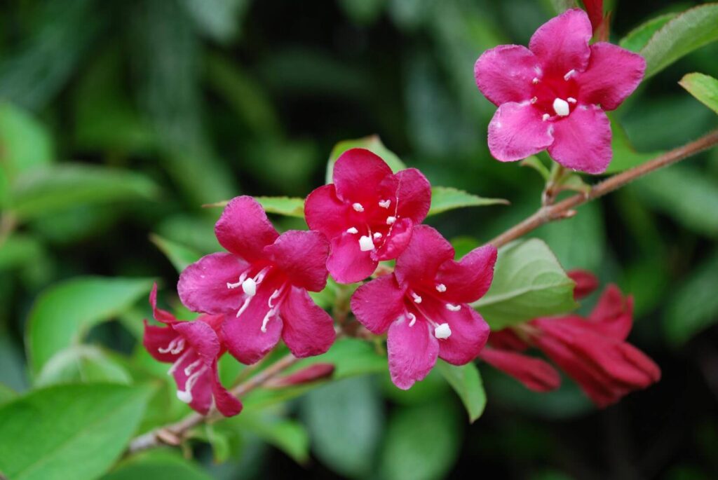 Вейгела относится к многолетним листопадным кустарникам. Максимальная высота взрослого растения – 2,5 метра, а ширина 3,5 метра. Годовой прирост – 20-25 сантиметров. Продолжительность жизни – до 50 лет. Любит солнечные места, плодородные дренированные почвы. Ярко-зеленые остроконечные гладкие листья. В осенний период меняют оттенок на золотистый. Цвести вейгела начинает дважды за сезон: в июле и в августе. Длится это около 2-х недель. Цветки в диаметре 4 – 5 сантиметра и 6 – 8 в длину, образованы 5-ю лепестками и напоминают колокольчики. Оттенок рубиновый. Образуют соцветия (5-6 штук в каждом). Источают приятный аромат.